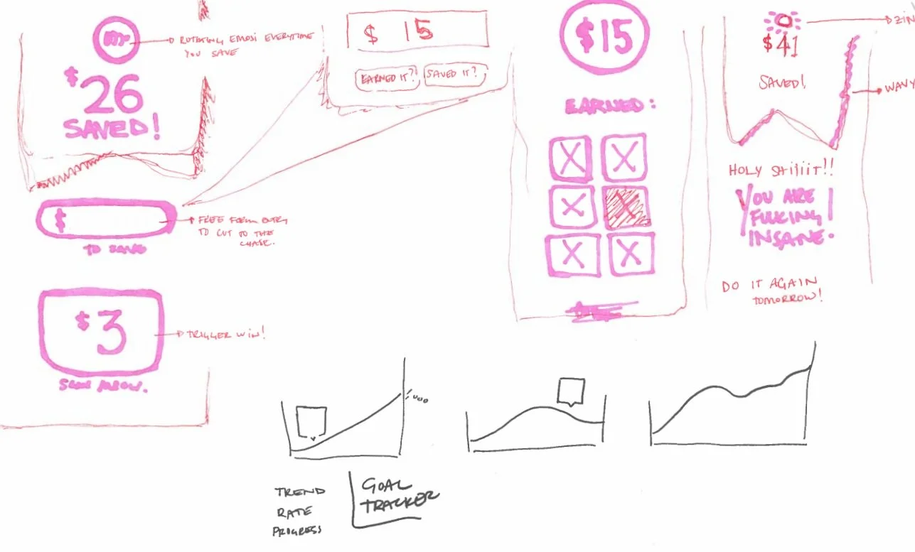 Through the lifecycle of Tap to Save, research and iterative testing was imperative. Competitive Analysis, focus groups, paper prototypes, qualitative month long user tests, UI preference tests, interviews, surveys, and pilot user tests were not only used to prove out the problem, but also pivot on the concept and functionality of the app. What started as a mindful based spending app featuring values based meditations, ended as a simplified behavior change savings app.